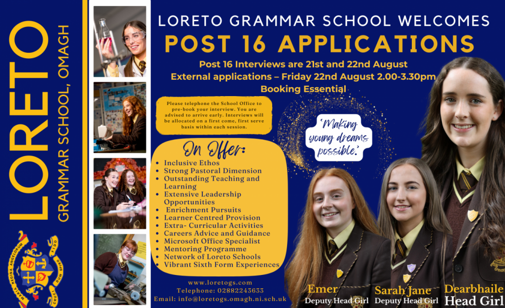 Our Post 16 subject offer in Loreto and Omagh Learning Community is extensive, encompassing general and vocational pathways within a curriculum which caters for all interests and learning styles. We provide opportunity for breadth of study and preparation for higher education, apprenticeships and employment.